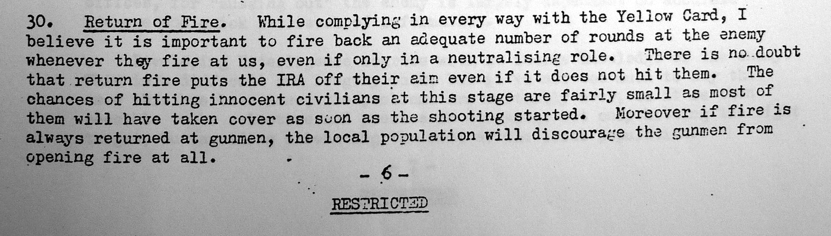The 3rd Battalion Royal Green Jackets insisted, Yellow Card restrictions notwithstanding, that it was ‘important’ that soldiers be allowed to fire an ‘adequate’ number of bullets back at IRA snipers since ‘return fire puts the IRA off its aim’, and the chances of hitting innocent civilians were ‘fairly small’ since they would have taken cover when the gunfire began. What that would mean in practice is not difficult to determine: