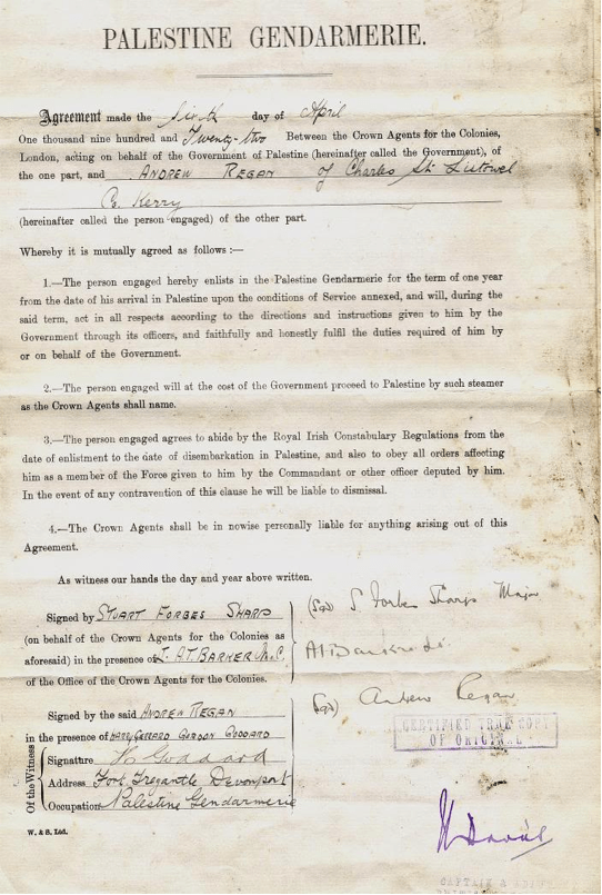In the early 1920s, RIC, Auxiliaries and Black and Tans recruited directly from Ireland provided the backbone for the British Palestinian Gendarmerie. Records show that many of these men were approached for recruitment while still serving in Ireland and eventually numbered over 700.