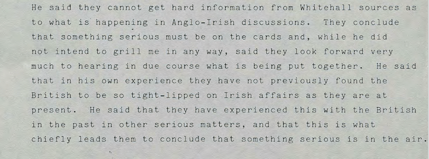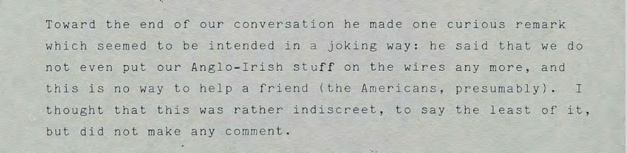 His report of the meeting to his masters in Dublin was sent by courier service to Iveagh House. He had marked it ‘Confidential’ but on receipt his superiors upped that to ‘Secret’. A quick reading (thanks to the release of the document in 2015) especially of the final paragraph, provides the reason for that upgrading: