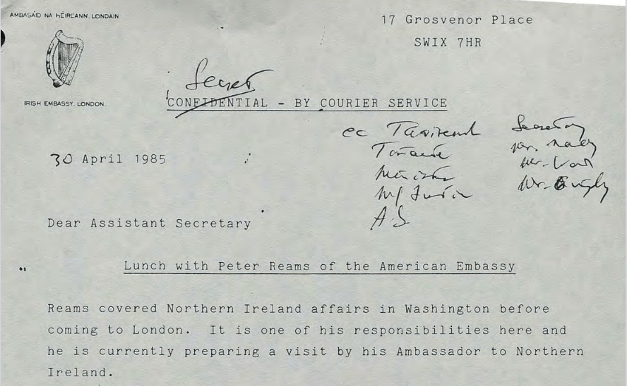 He also broke bread with fellow diplomats, especially those representing Britain’s allies, in an effort to discover what they might know. So it was that on or around April 30th, 1985, he lunched with one Peter Reams, an official in the US Embassy who previously had responsibility for Northern Ireland matters in the State Department in Washington.