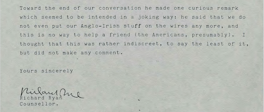 As a result Ryan’s superiors decided to no longer trust electronic communication and instead used the services of a courier service, one of whose first missives delivered to Iveagh House seemingly warned of a similar exercise by the Americans.
