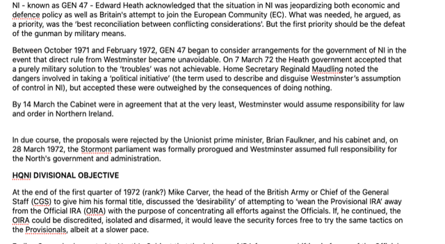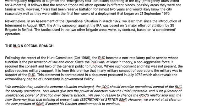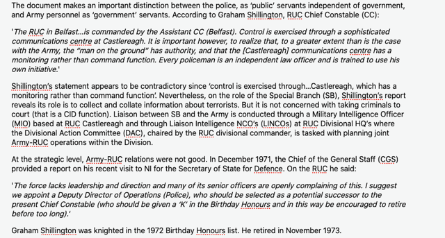623 This was a highly contentious issue that had received a great deal of attention inside the SIS on occasions in the past, quite apart from equally detailed attention in other Government departments, as well as critical comments in Parliament and elsewhere. We were not impressed by the bland reference to the document being “imperfectly drafted”, and consider that the lack of care shown merits criticism. The Inquiry has examined all the material held by SIS relating to Sir Maurice Oldfield as described by SIS Officer A in his statement of 8 December 2016 and found nothing to indicate that Sir Maurice Oldfield ever visited Northern Ireland before he took up his appointment as Security Coordinator in October 1979.